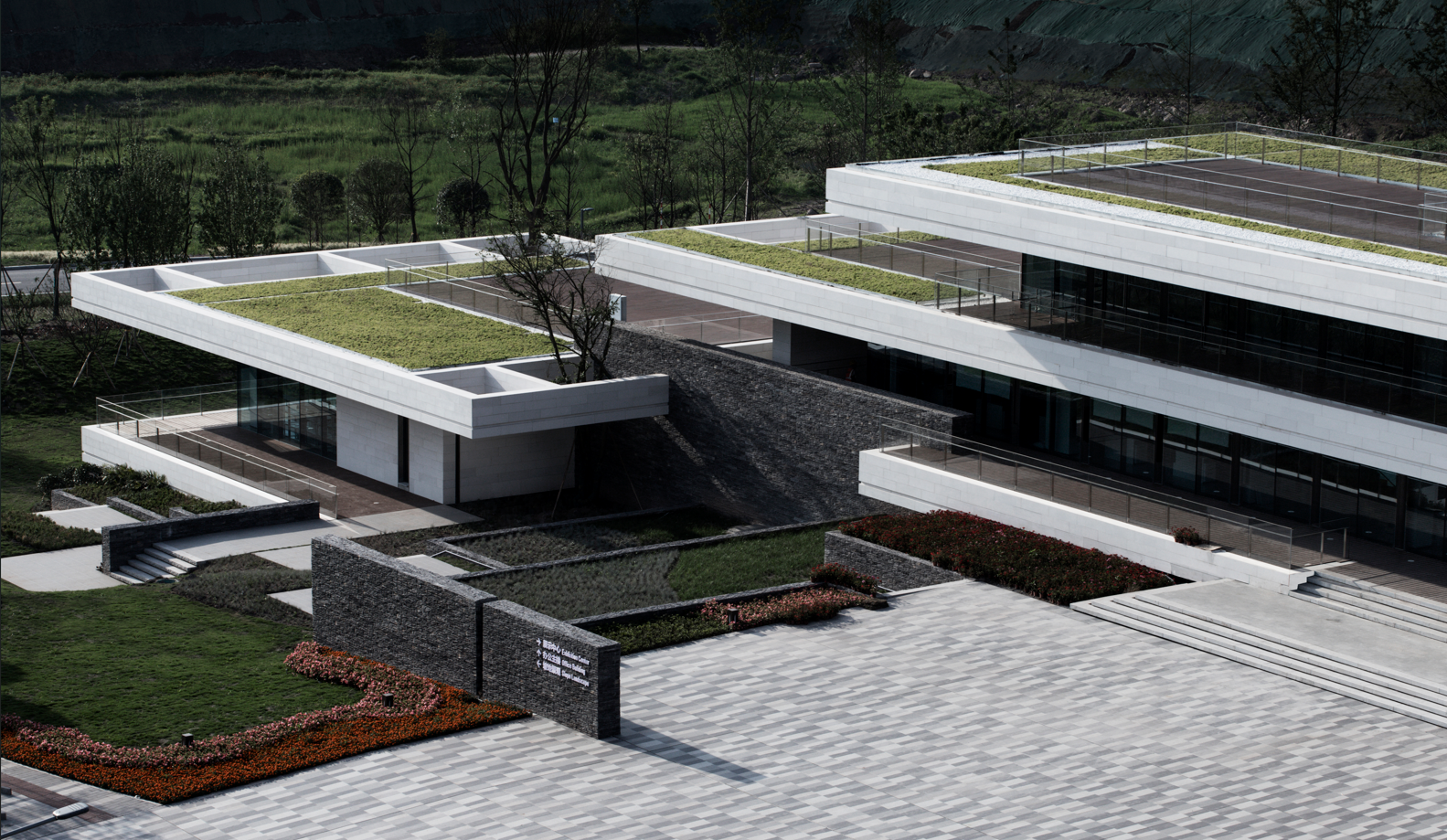 项目位于两江新区创新区,为新区建设指挥中心提供办公,餐饮,展示等功能,面积约3600平。基地位于局部制高点,东面临湖,三面俯瞰新区全景,景观资源绝佳。东侧主要道路,南侧西侧为次要道路,用地几何形态狭长,场地落差高达 20多米。我们将餐饮服务,办公,展厅三个功能组团根据功能属性,沿山势标高错位布置,最大限度减少土方调整,同时每个功能组团景观视野互相不遮挡,下一层的屋顶同时也是上一层的平台。材料用色要考虑当地气候和环境。重庆大部分铅灰色阴郁天气,灰色和深色在这个环境下容易给人压抑的感觉,因此主材颜色选择偏白色调的仿石混凝土,既低调稳重又彰显存在感,竖向实体采用深灰文化石,粗犷的质感与山地融为一体,同时与细腻的白色主材形成有趣的对比。细部控制–落地的保证。我们希望呈现纯粹而低调的建筑特质,而不去过分炫耀立面。挑檐作为主要表现元素,采用白灰色混凝土挂板,横向采用错缝,竖向企口密拼,增强立面的体量感,凹槽划分弱化尺度,减少挑檐厚重感。“看不到”的设计才是最需要功夫的。内凹式 V 窗的创新应用,开启和关闭不影响立面平整度,局部飞边+点釉,遮挡金属与玻璃交接节点,同时也方便施工。这是一次积极而有意义的山地建筑探索,都设作为价值发现者,场地的制约在另一个视角下可能是最大的优势,在当下浮躁的建筑环境下,让建筑回归“空间”这一本质。